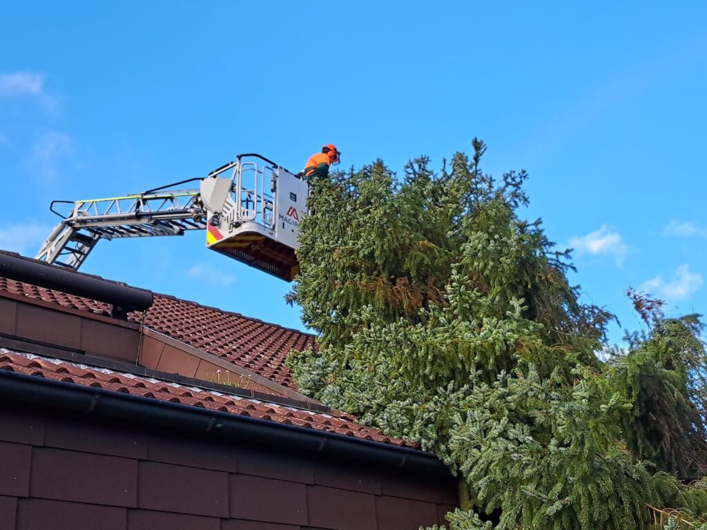Ein Baum war herabgestürzt und drohte ein Haus zu beschädigen. Mithilfe der Drehleiter aus Herrenberg wurde der Baum teilweise abgetragen, um so die Angriffsfläche zu vermindern. Ein zweiter Baum konnte stehen bleiben.